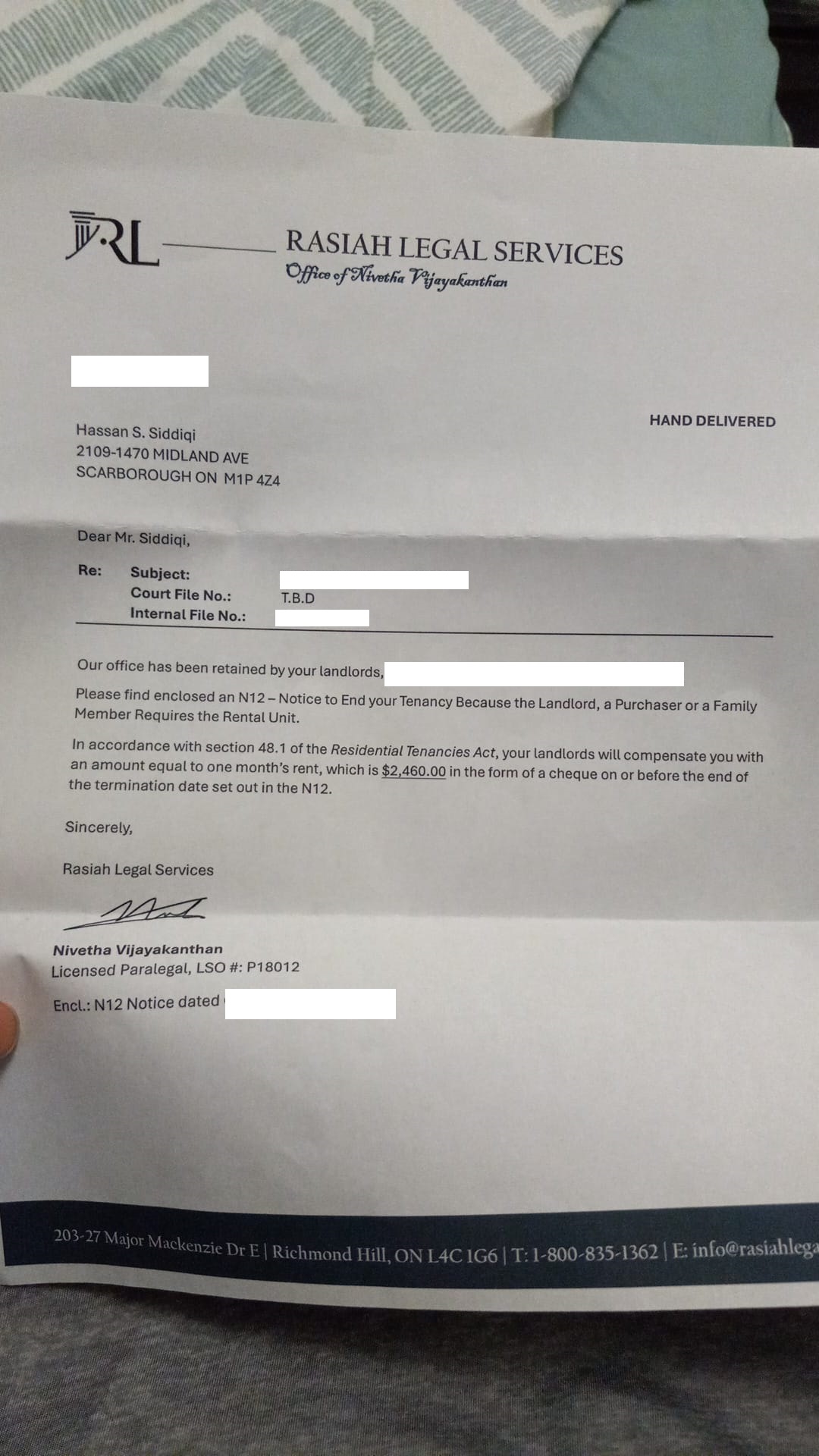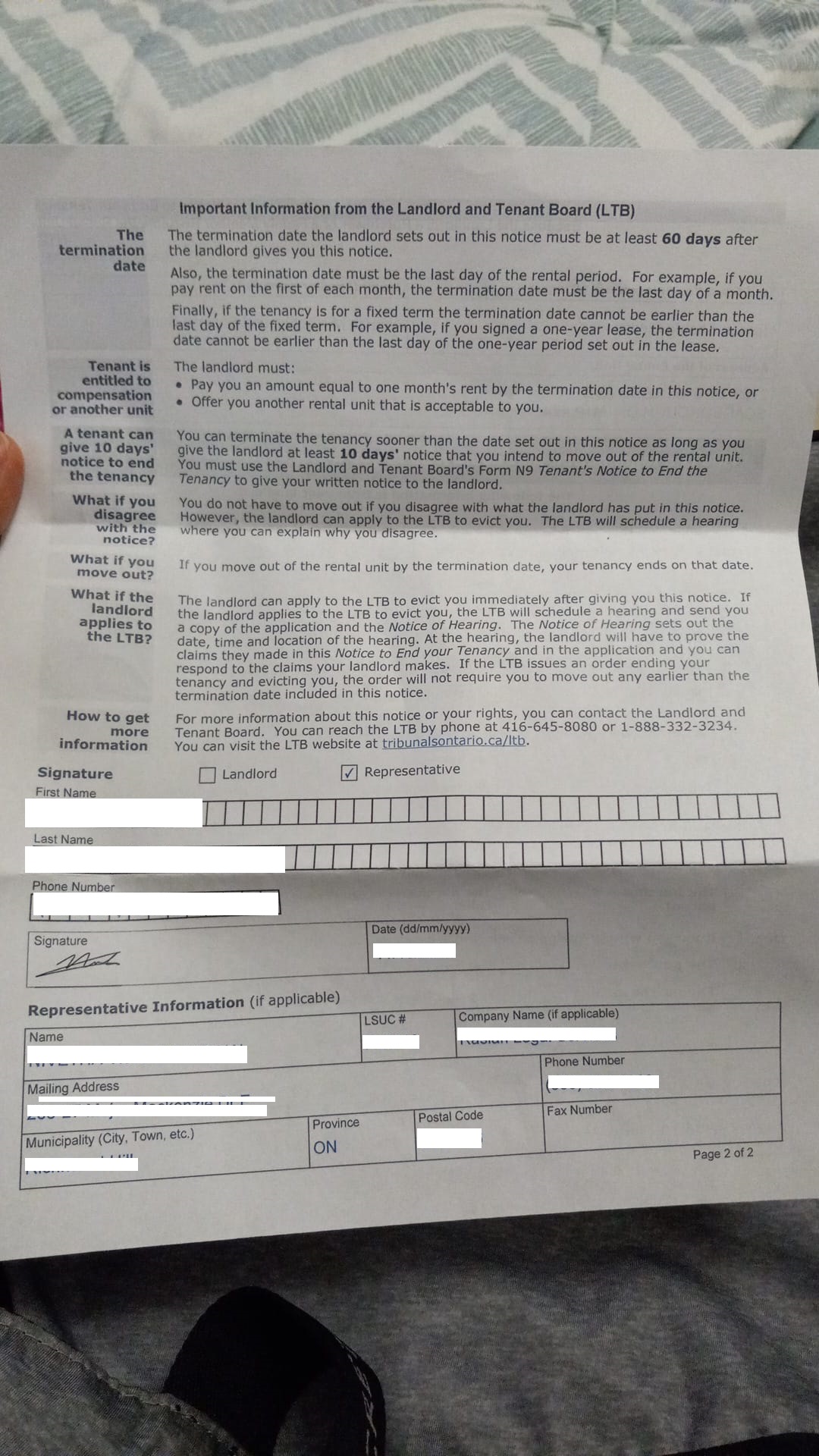 The LTB application was filed and we went to a mediation hearing where we agreed to extend the move out date by a few months. I advise tenants to have everything documented with this landlord and get educated with the Residential Tenancies Act.