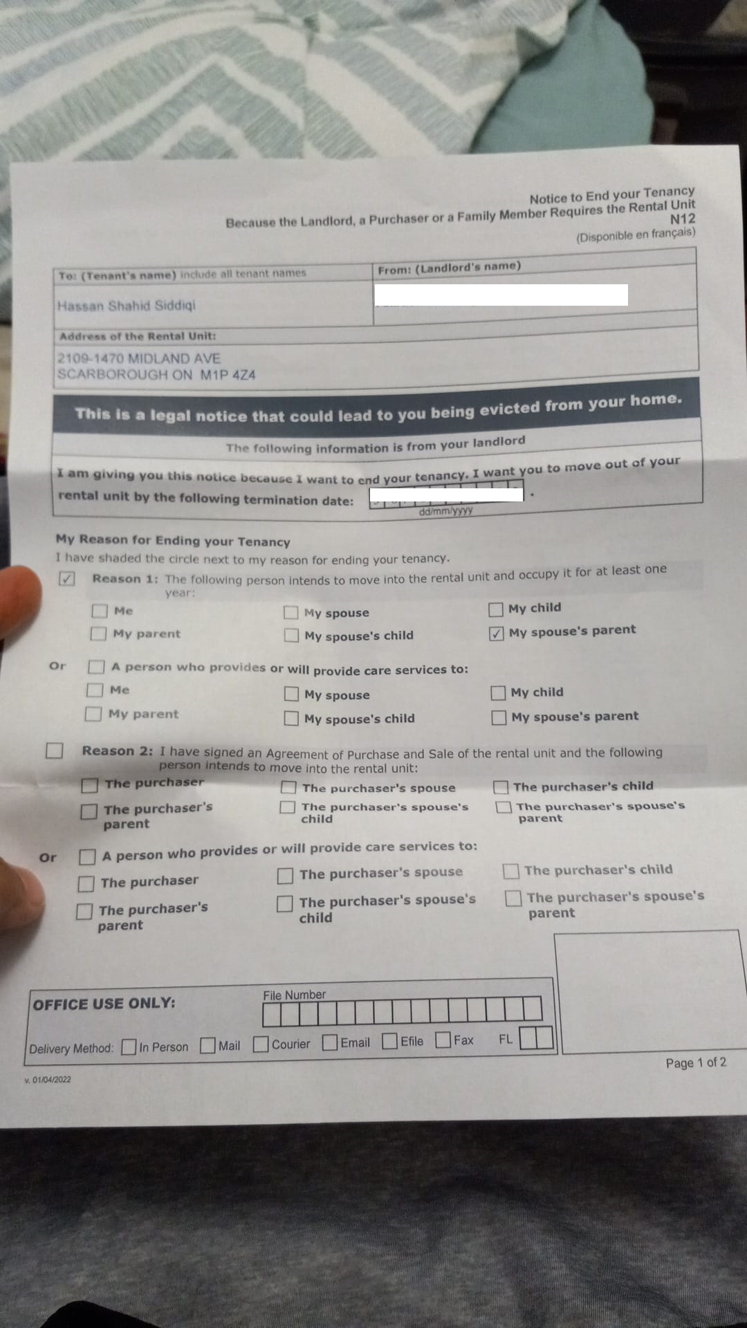 I have stayed in this unit since 2020. I received an N12 from the landlord. He claims his spouse's parents (In-Laws) want to move in.